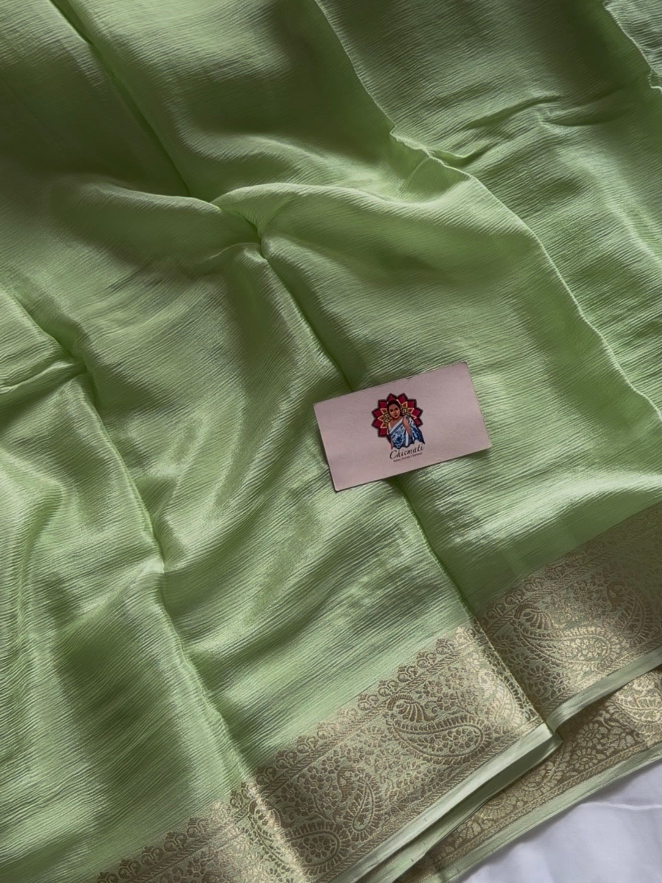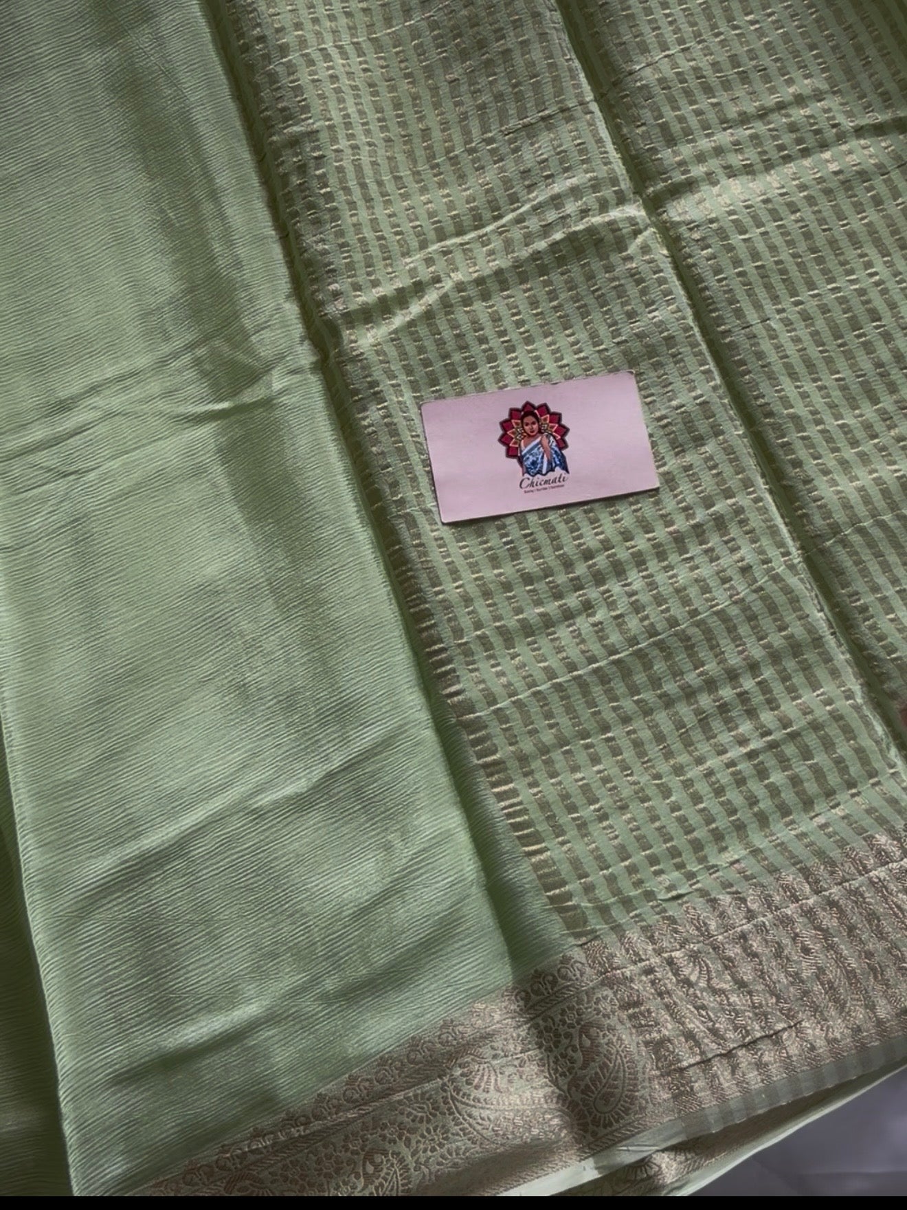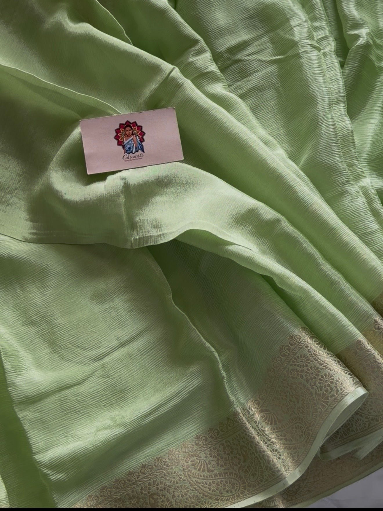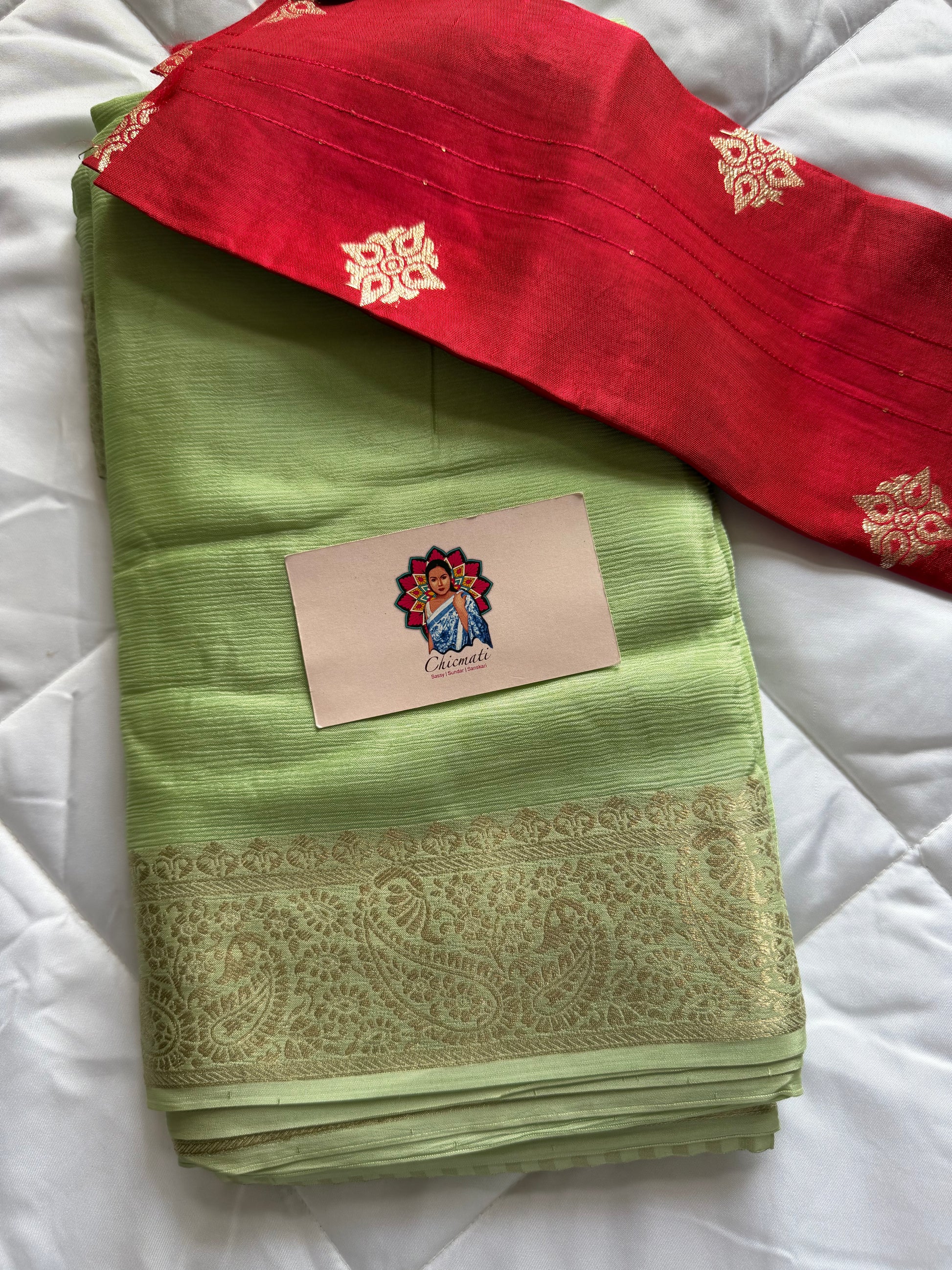 Step into elegance with our Pistara Chinnon Saree, crafted in soothing pastel green tones that glow with effortless grace. The saree features a soft, luxurious viscose chinnon fabric with a delicate gold border that adds a subtle festive charm. Paired with a rich red viscose Russian jacquard blouse, this combination brings together modern sophistication and traditional allure.