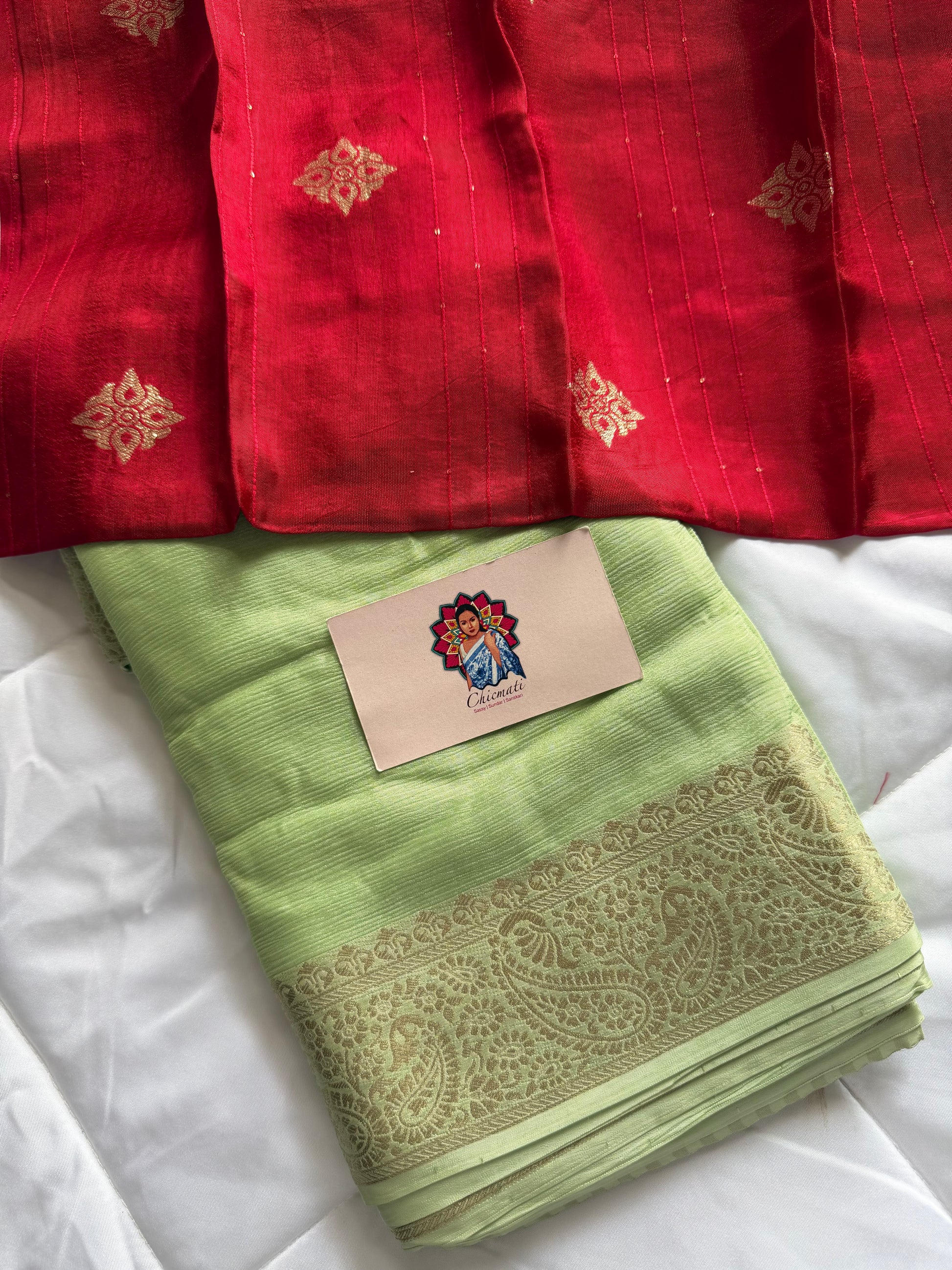 - Color: Pastel Green Saree with Red Blouse