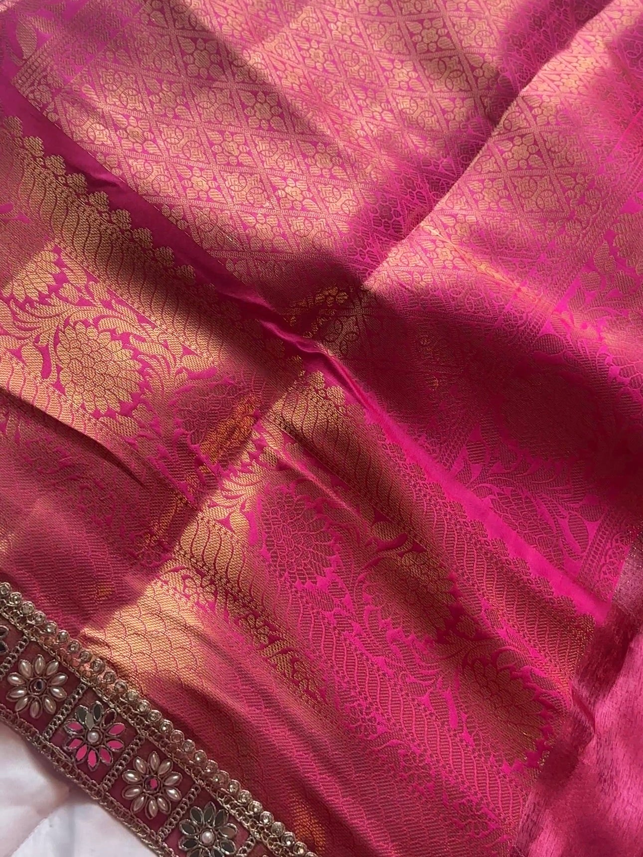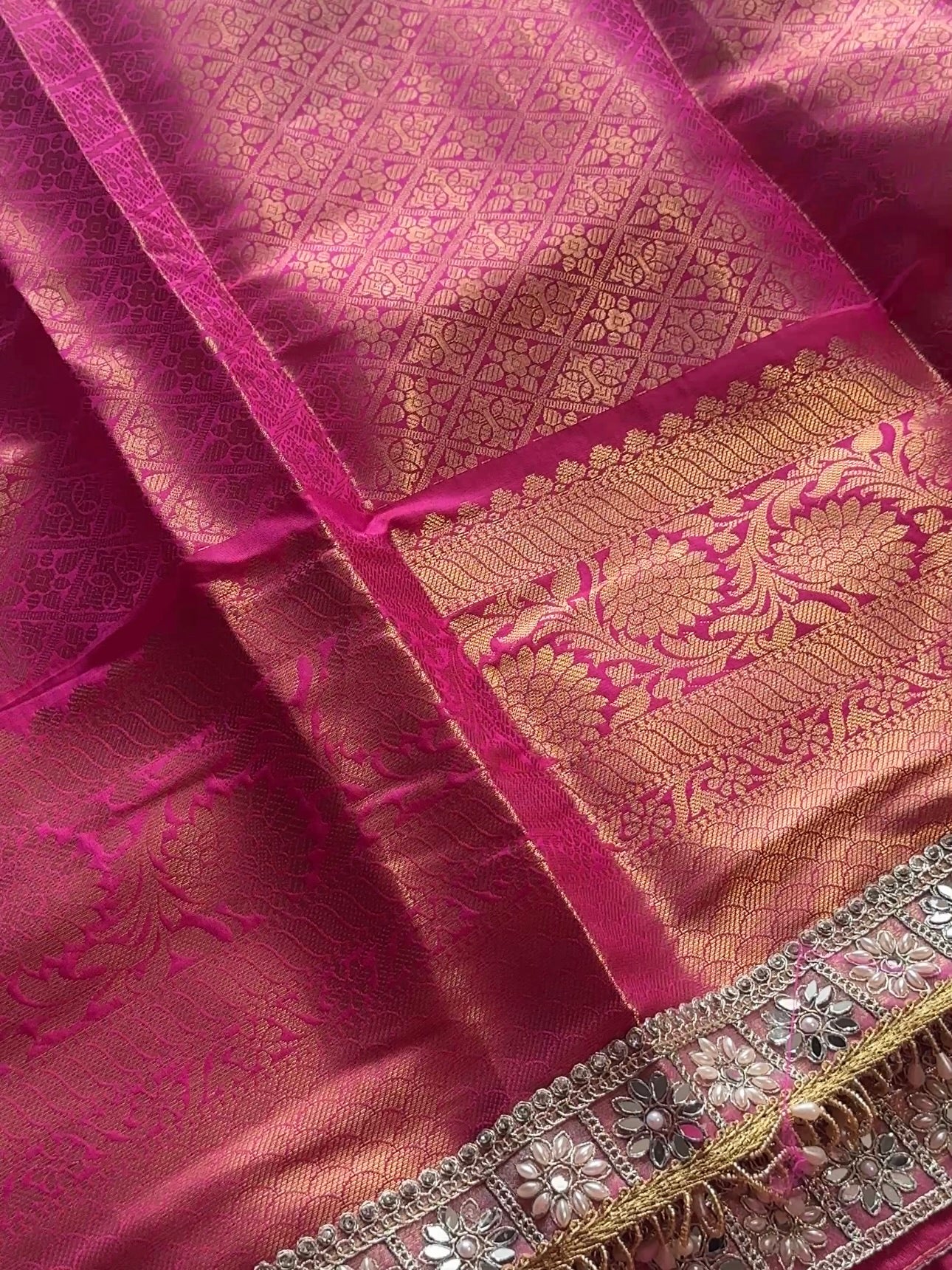 This saree is the perfect blend of traditional Banarasi artistry and Kanjivaram elegance, making it an ideal choice for weddings, festive occasions, and grand celebrations.