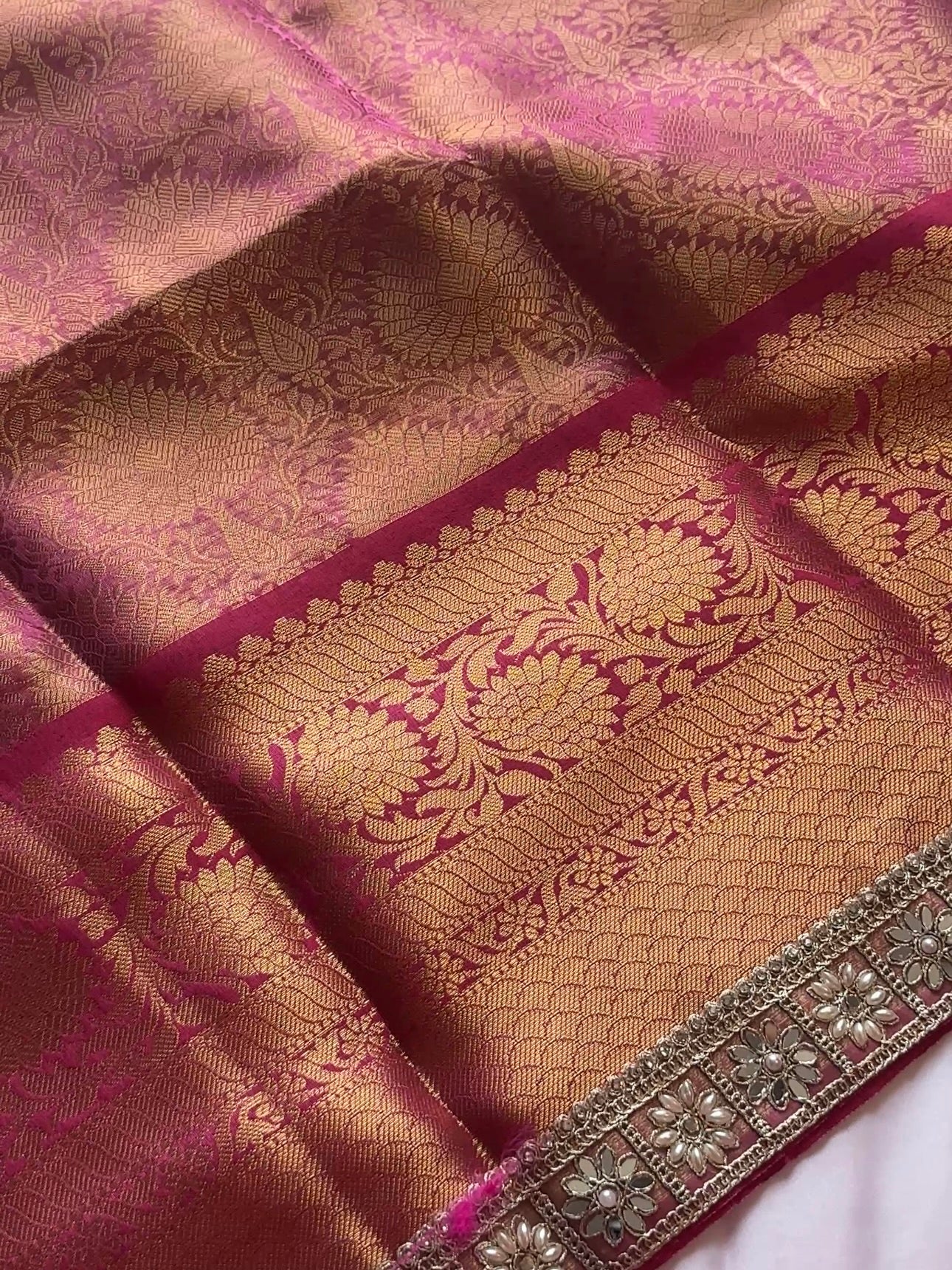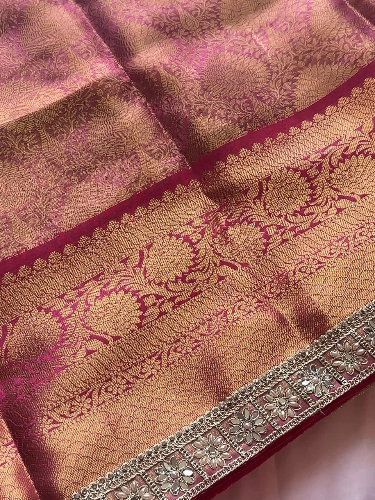 Elevate your wardrobe with our Banarasi Semi Kanjivaram Lace Work Saree, featuring exquisite floral zari weaving that adorns the entire fabric. The saree is beautifully designed with a trending zari border, enhanced with an attached designer lace, adding a modern and graceful charm.