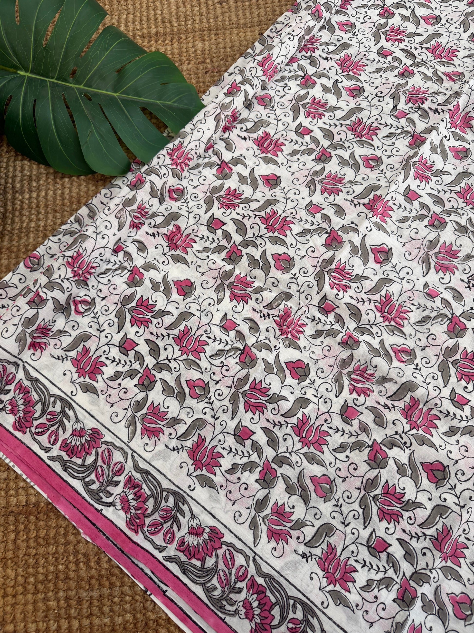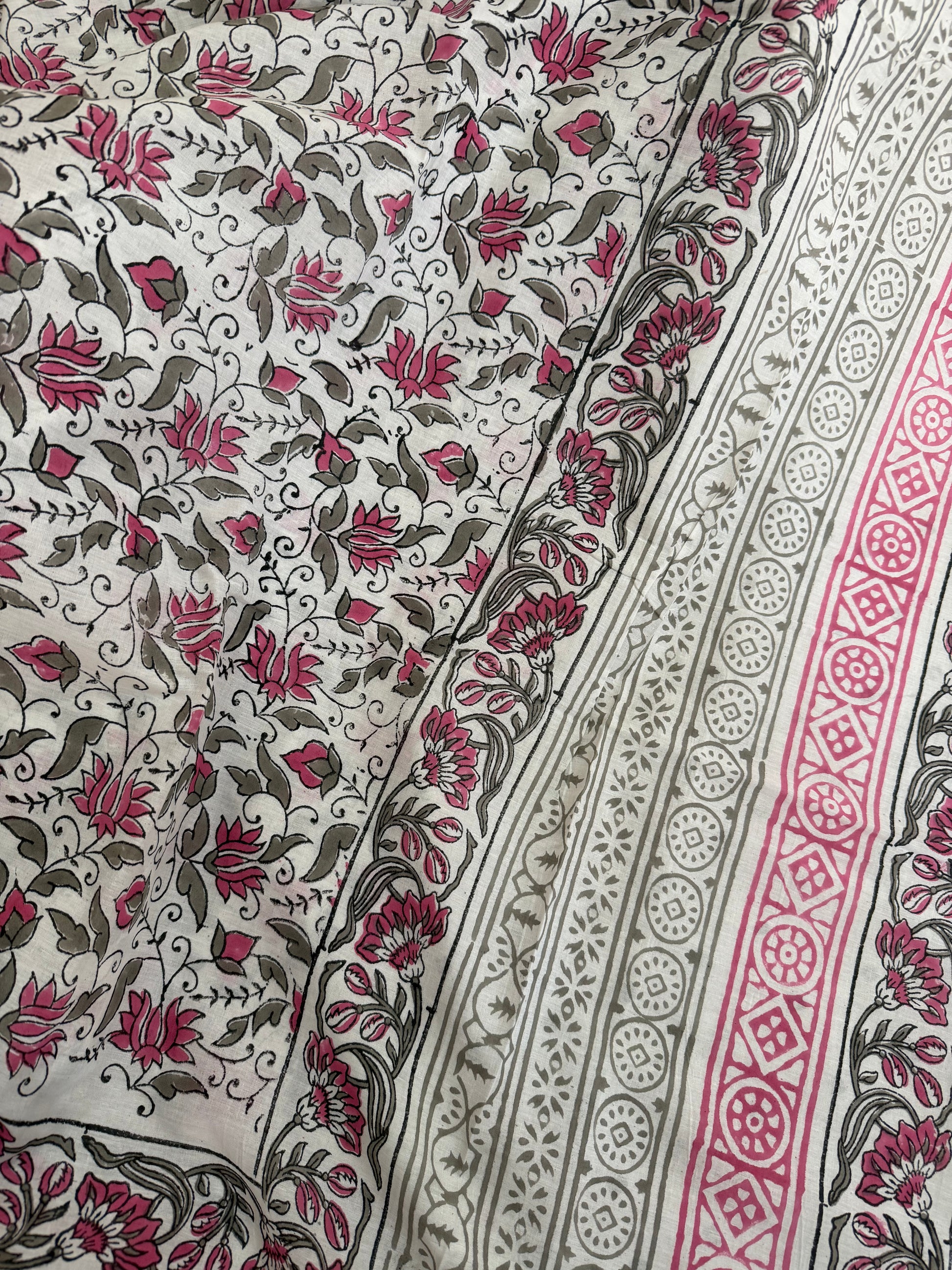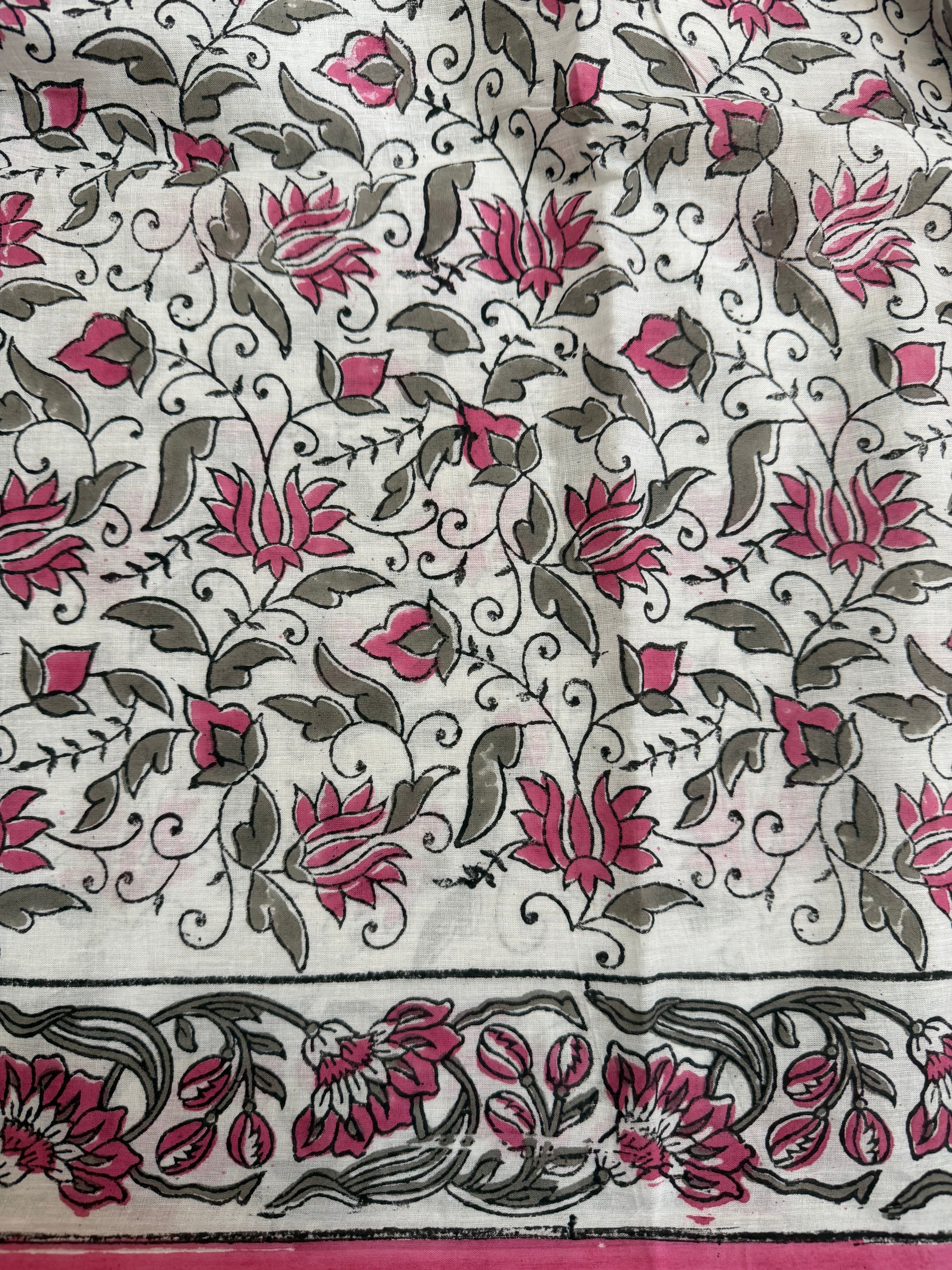 • Each saree is hand block printed, so slight variations in motifs, alignment, or spacing are natural.
