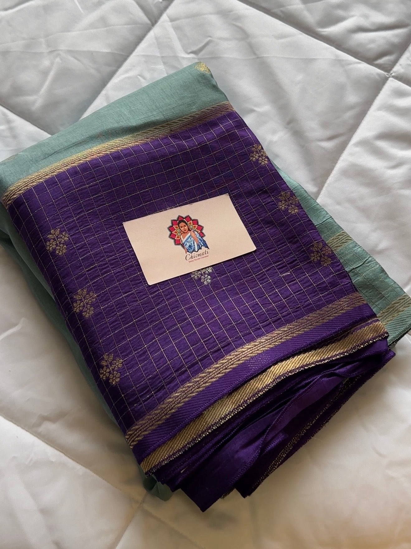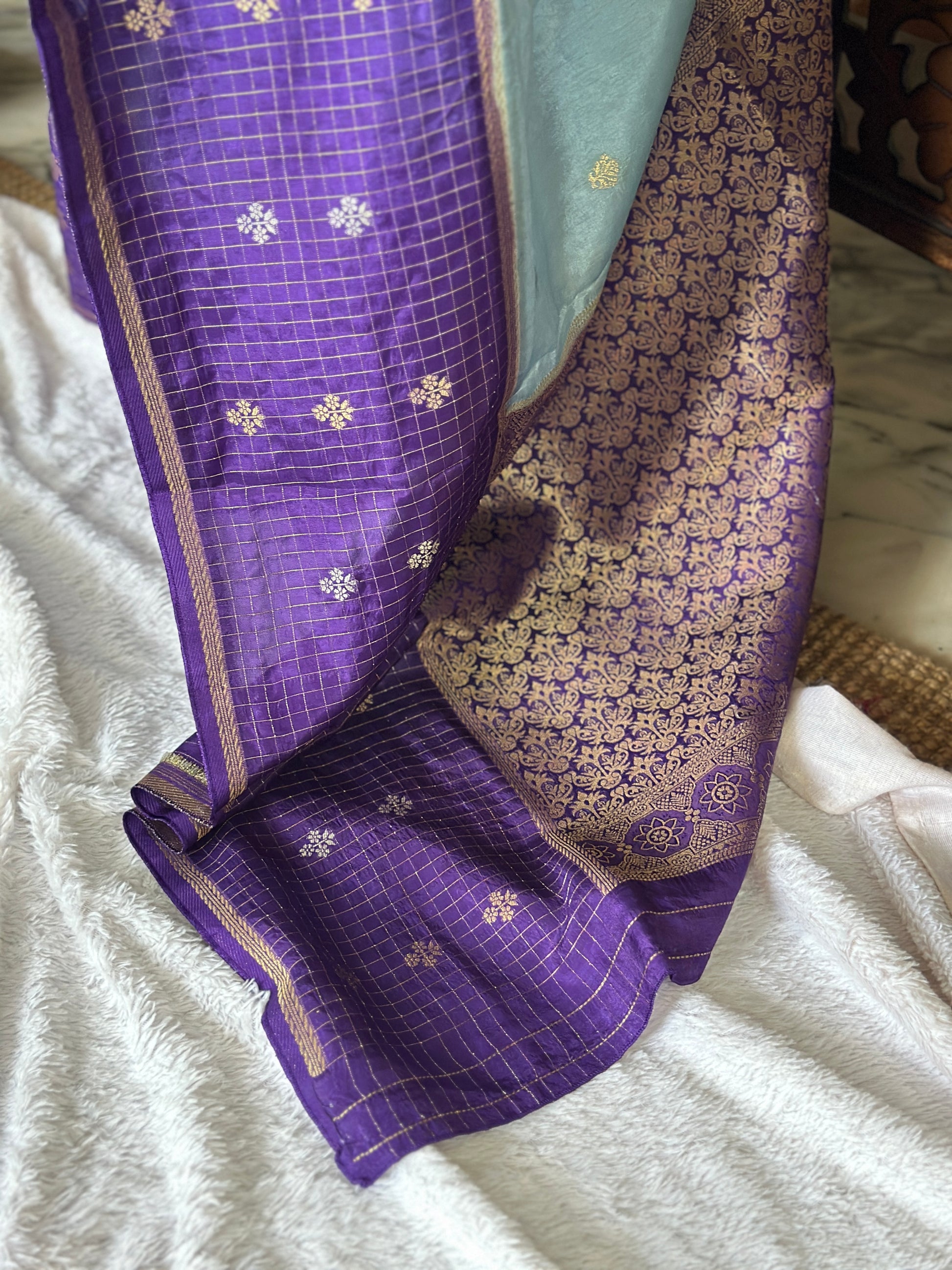 Elevate your ethnic wardrobe with this stunning viscose tIssar satin saree featuring a delicate powder blue base perfectly paired with a rich purple border. The saree exudes sophistication with its vintage checks purple border that adds a timeless charm.